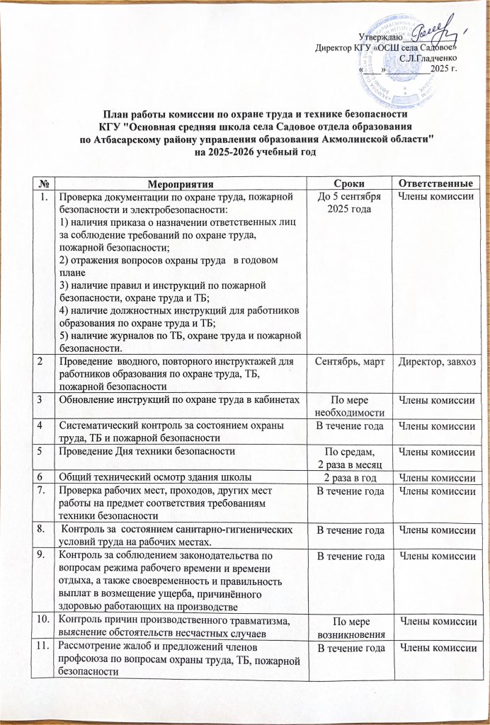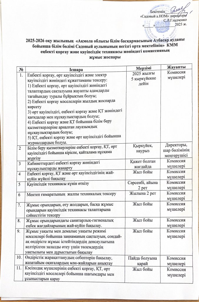 Еңбекті қорғау және қауіпсіздік техникасы жөніндегі комиссияның жұмыс жоспары.